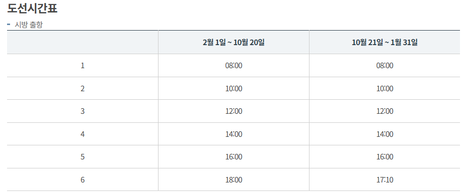 - 항차 간격: 대략 2시간 간격이며, 승객 수요가 많으면 수시로 추가 운항 (주말 오전은 수시 운항)
