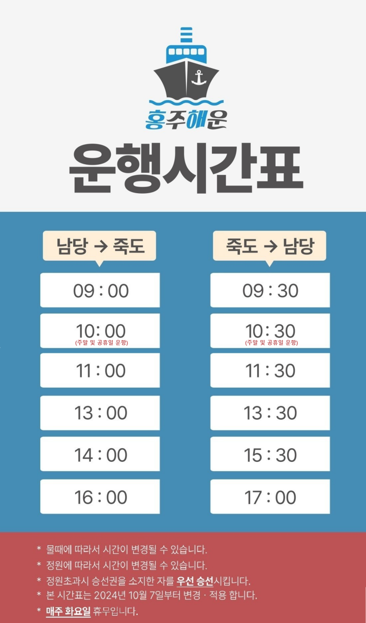 특히, 기상 상황과 계절 성수기 등 변수가 많기 때문에, 홍주해운 공식 홈페이지를 통해 실시간 운항 현황과 요금을 사전에 확인해 두는 것을 추천드립니다.