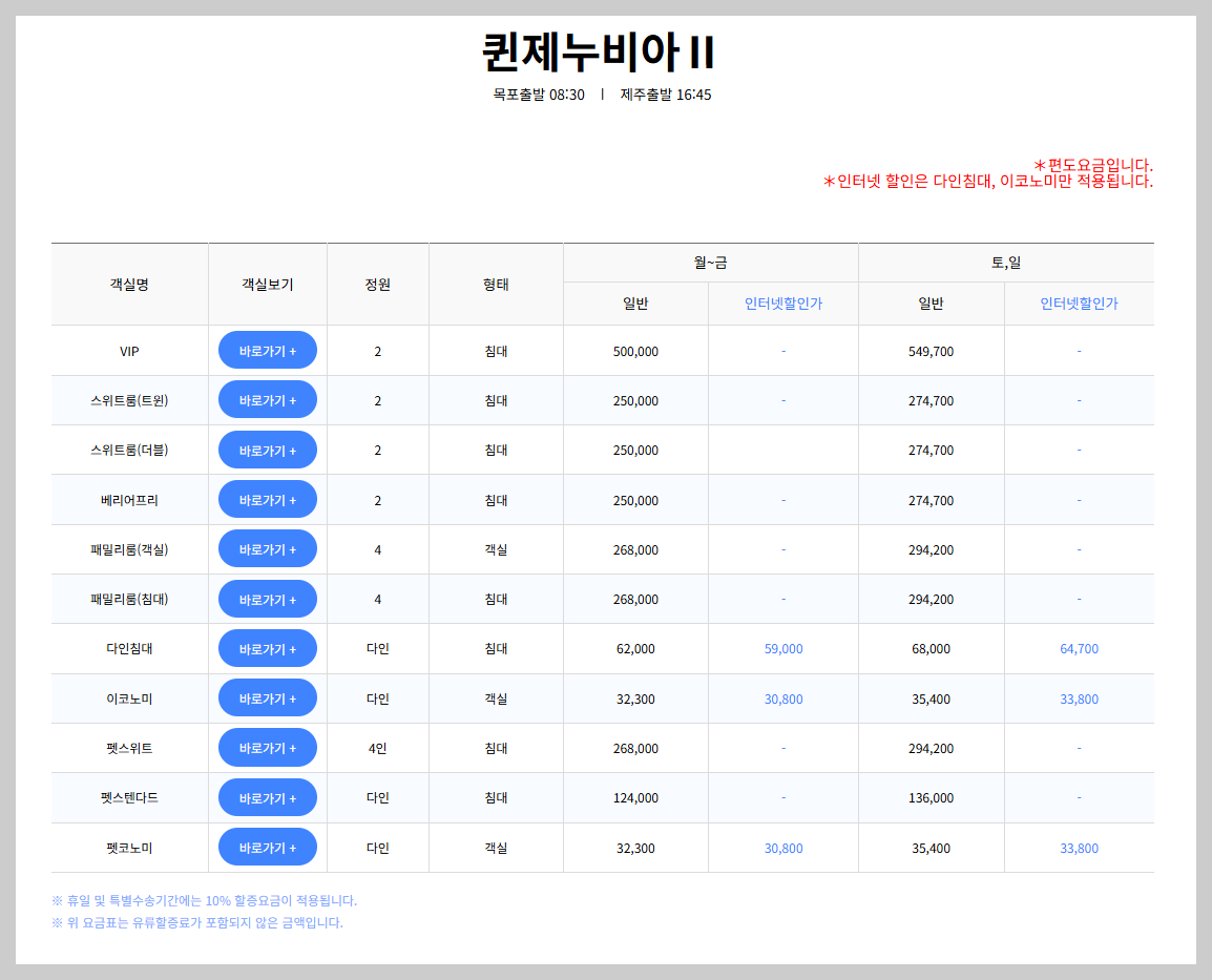 배편 승객 요금은 좌석 종류와 객실 등급에 따라 다양하게 책정되며, 일반실은 약 32,000원대부터 시작해 VIP룸이나 스위트룸 같은 고급 객실은 최대 50만 원대까지 올라갑니다. 요금은 객실 내 휴식 공간, 개인 프라이버시, 전용 화장실 유무 등에 따라 달라지므로 여행 목적과 예산을 고려해 선택하는 것이 좋습니다. 또한 일부 할인 이벤트나 왕복 예약 할인도 제공되므로 예약 시 이를 꼭 확인하는 것이 유리하며, 성수기에는 조기 매진될 수 있어 가능한 한 사전 예약을 권장합니다.